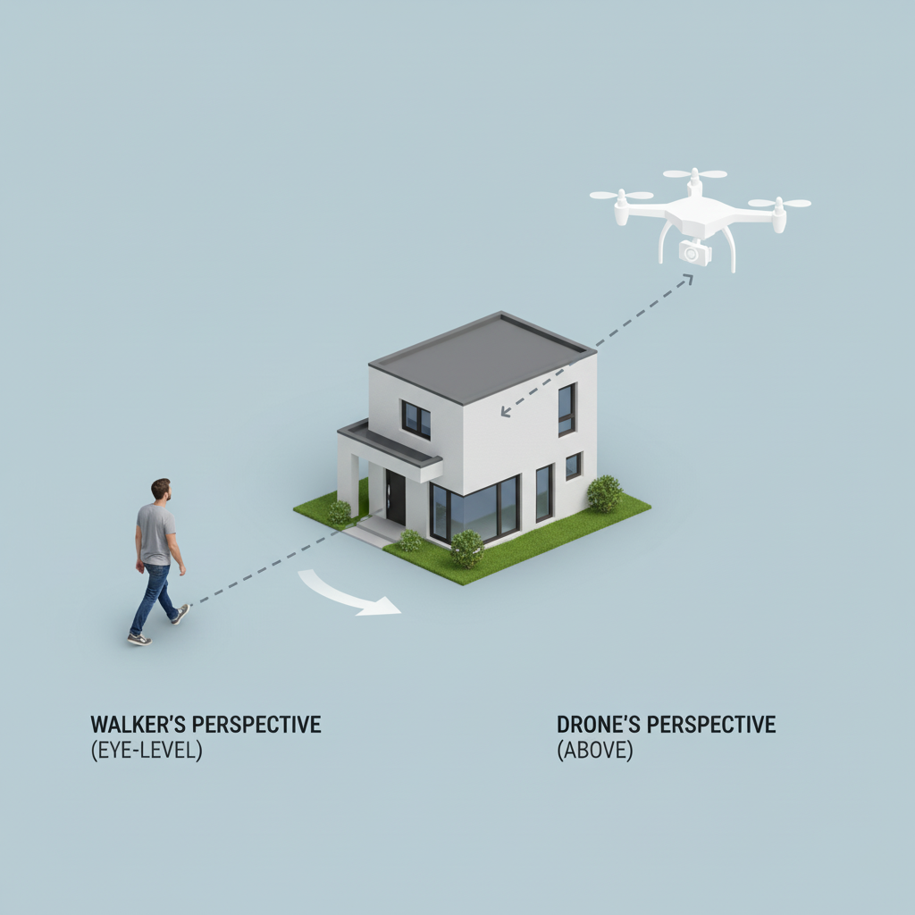 This diagram illustrates the difference in perspective between a person on the ground (eye-level) and a drone flying above. While a person views the building from its side, a drone provides an aerial, top-down view, revealing different aspects of the structure and surrounding area.