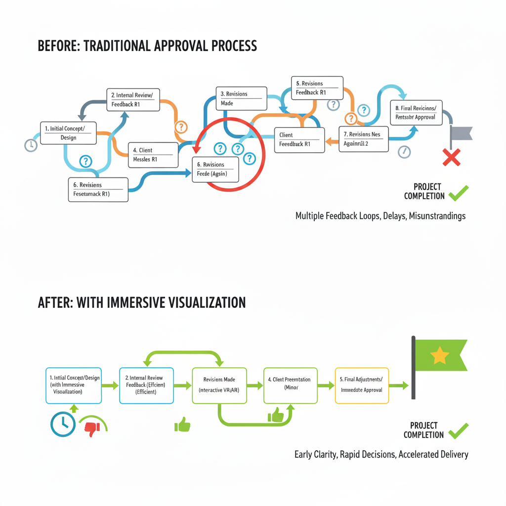 Streamlining the approval process with immersive visualization. See how a traditional workflow's multiple feedback loops and delays are transformed into a faster, more direct path, leading to quicker approvals and project completion.